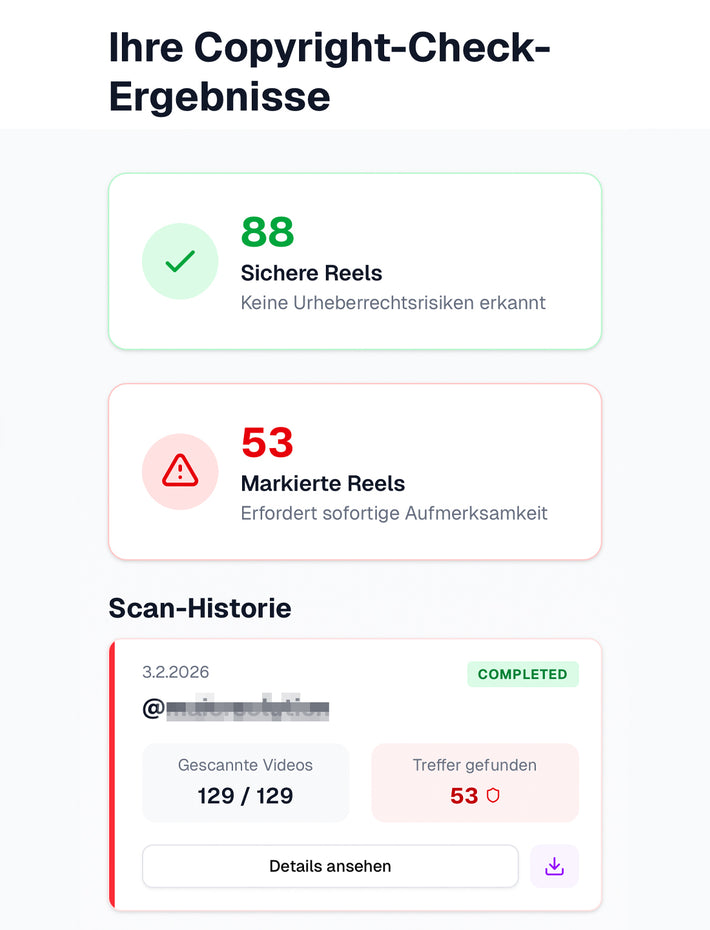Coyprightchecker.de analysiert alle öffentliche Reels eines Instagram Accounts, alles automatisiert & erstellt einen strukturierten Risiko-Report.